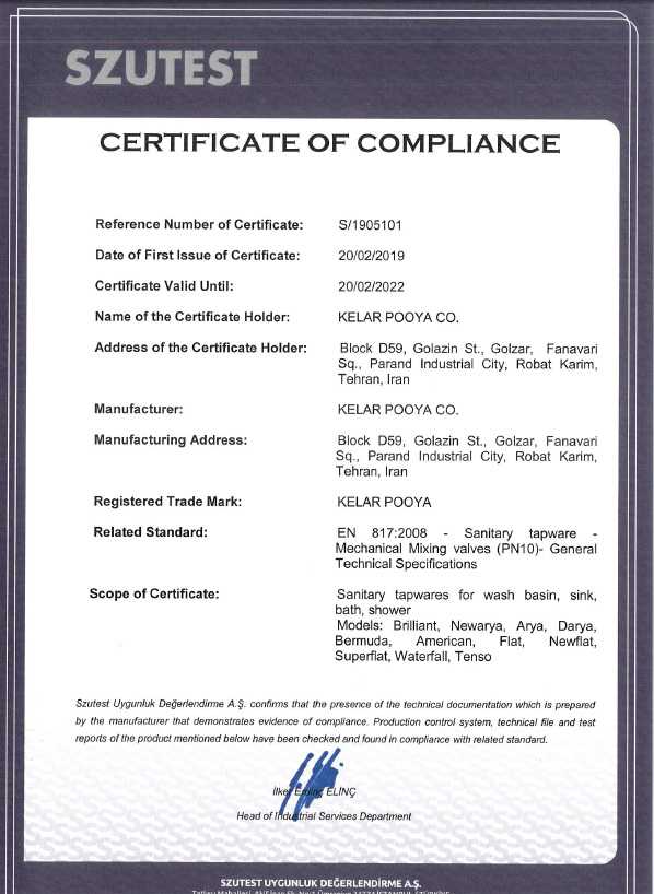• دارنده استاندارد و جایزه بین‌المللی DQD-sanitary valves تضمین کیفیت، دوام و طراحی برتر در تولی شیرآلات بهداشتی از سوی کشور آلمان