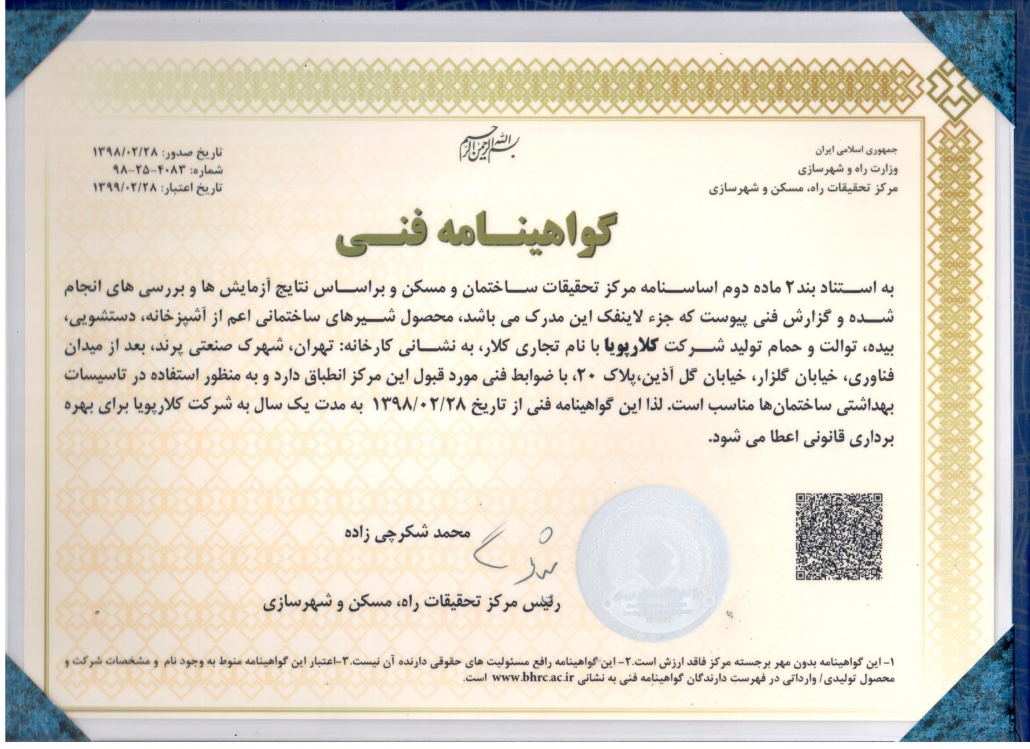 • دارنده گواهینامه استاندارد از مرکز تحقیقات مسکن و شهرسازی